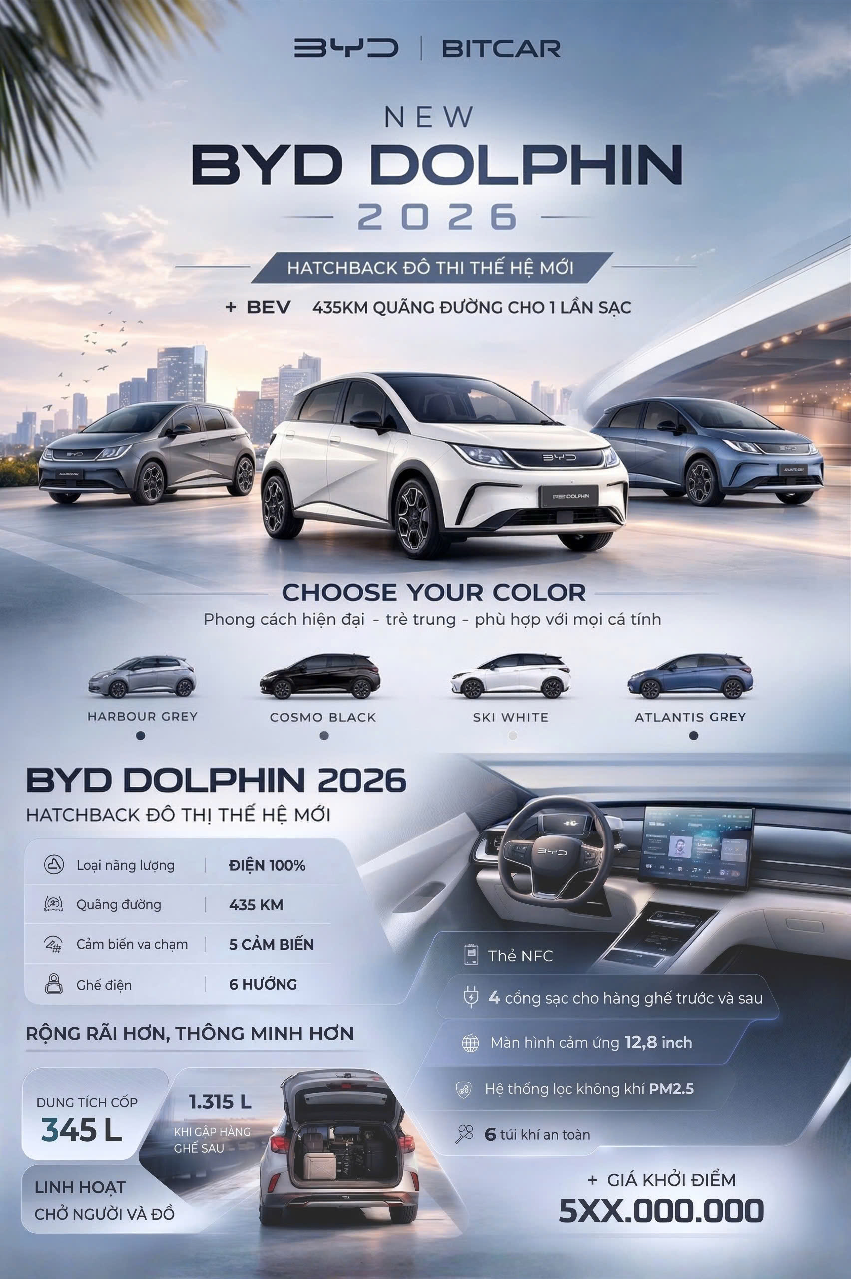 BYD Dolphin 2026 dự kiến ra mắt tại Việt Nam vào tháng 4/2026 và đang nhận được nhiều sự quan tâm từ khách hàng yêu thích xe điện đô thị.