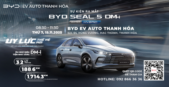 BYD Thanh Hóa hân hạnh gửi lời mời đến Quý khách hàng tham dự sự kiện giới thiệu mẫu xe BYD Seal 5 DM-i chiếc Sedan Super Hybrid mới, nổi bật với khả năng vận hành hiệu quả, tiết kiệm và công nghệ đột phá.